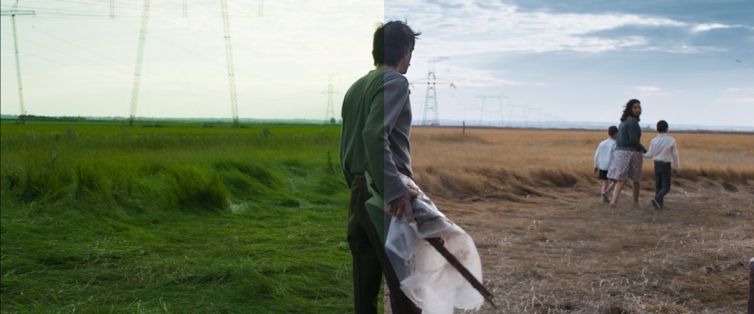 Az első példa első kockáján, azon túl, hogy zöldell a fű, a szereplők is alulexponáltak, ráadásul beleolvadnak a háttérbe. Az operatőr nagyon is helyesen választotta ezt az expozíciót, mivel minnél több információt akart megőrizni, rögzíteni. Ha a szereplők jó helyen vannak expozícióban, az ég kiég… A snitt ráadásul rendkívül hosszú, és ami ennél is fontosabb, térben is nagy mozgásokat kellett követni a kamerával. Így a másik megoldás, a világítás és derítés, mint lehetőség kiesett…